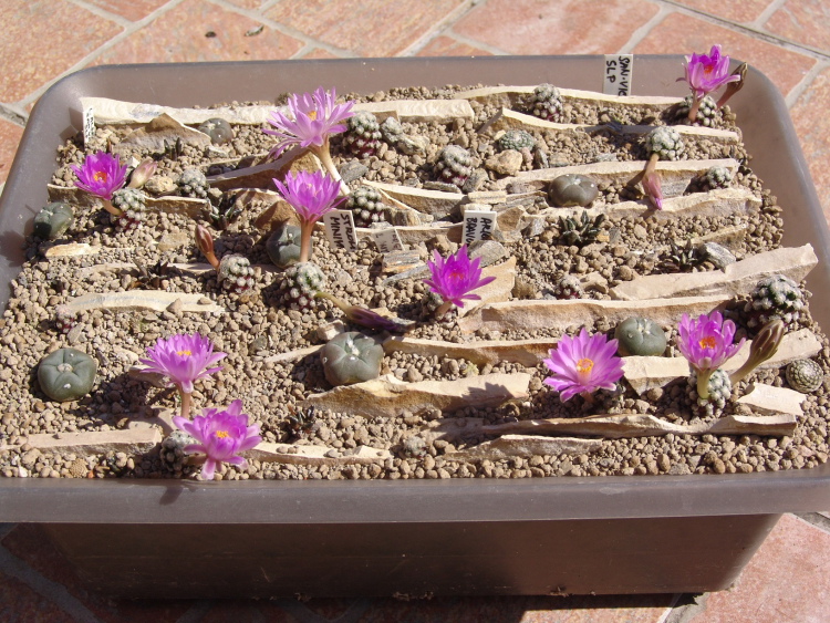 Druhá sesazenka je v korýtku s kousky opukových štěpinek, vše je zasazeno do čisté pemzy. Je to vyrobeno teprve loni, uvidíme, jak ten terén bude zarůstat. Snažil jsem se sázet jen miniaturky…