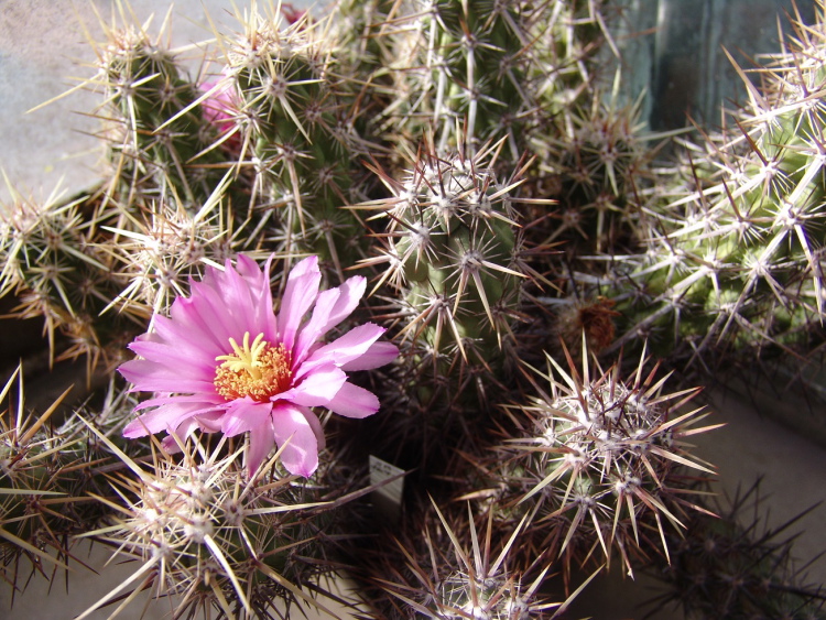 Do třetice poslední z dolno-kalifornských echinocereusů, E. brandegei. Ten kvete určitě jako jeden z posledních – ne-li úplně poslední echinocereus. Ve sbírkách kvete také dost dlouho po výsevu, má ovšem dost velké nároky na místo, po letech trs dorůstá půlmetrové šířky. Často se v přírodě vyskytuje společně s rostlinami zobrazenými na předchozím obrázku – E. ferreirianus.