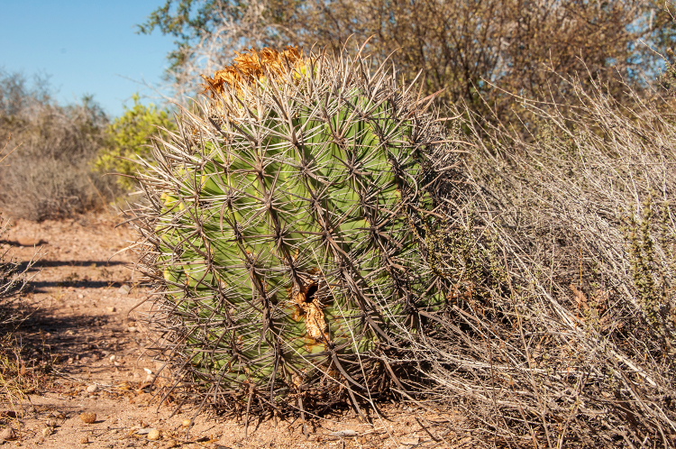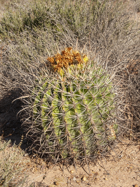 Slunce neúprosně pálí, teplota vzduchu rychle vzrůstá. Prodíráme se vegetací a na volných plochách nacházíme první rostliny Ferocactus tiburonensis. Nejprve si nejsme jisti, a tak porovnáváme rostliny s popisy. Postupujeme dále a nacházíme další a další rostliny různých velikostí. Po několika hodinách docházíme na úpatí kopce a kaktusy vidíme ve svahu. Některé dorůstají výšky 1 m. Tonda při pohledu vzhůru oznamuje, že není kamzík a zůstává dole. Fotíme a pak se rozhodujeme k návratu nejkratší cestou k moři, kde bude čekat Ernesto a oba Václavové, kteří se zhruba v půli cesty rozhodli pro návrat k loďce.