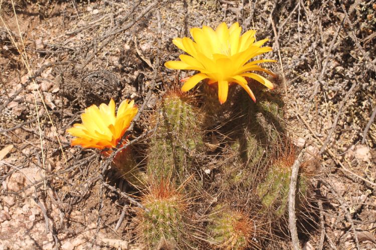 V rámci naší dovolené v listopadu 2012 jsme si je vytypovali jako místo s přijatelnou noční teplotou pro táboření. A tak po dni stráveném a žhnoucích pláních La Rioja míjíme v podvečer stejnojmenné hlavní město provincie, na benzinové pumpě doplňujeme zásoby vody a benzínu a stoupáme směrem na Villa Sanagasta a krátce po projetí městečka přijíždíme k odbočce. Poutač láká turisty k návštěvě a hned vedle je tabule s instrukcemi pro cyklisty. Cesta je jako nová, čím výše, tím strmější a mnohde se musíme vyhýbat napadanému kamení. Na skalách nad cestou září v posledních paprscích zapadajícího slunce otevřené květy Trichocereus candicans. Náhle silnice začíná klesat a mezi kopci vidíme široké údolí s plochým, mírně zvlněným dnem. Silnice vede po okraji údolí dále a končí pod horou spolu s údolím. Jsme tu sami, ale zdaleka ne první, koho napadlo zde tábořit. Za balvanem je už připravené ohniště s tlustou vrstvou popela. Rychle stavíme stany a skoro potmě připravujeme večeři. Kromě drobné opuncie rodu Airampoa, kterou jsem nahmátl při sběru dříví, jsme zatím kolem tábořiště na žádný kaktus nenarazili. Noc byla jasná a příjemně chladná. Ráno byly orosené hlavně stany, vegetace sestávající z keříků, z nichž dokážu identifikovat jen akácie, zůstala suchá. Některé keře již kvetou, ale celkově je vegetace šedivá a unavená. Zjevně zatím čeká na první jarní déšť. Stany pod svahem jsou ještě ve stínu kopců ohraničujících údolí ale svah nad tábořištěm je nasvícen vycházejícím sluncem. Nedočkavě stoupáme a těšíme se na květy T. candicans. Kaktusy začínají hned na úpatí svahu, kde rostou trsíky Austrocylindroopuntia verschafeldtii, žlutě kvetoucí Airampoa a Cumuloopuntia boliviana. Nějakých 50 m nad tábořištěm nacházíme první kulovitý kaktus. Je to Lobivia (Soehrensia) formosa var. velazcoensis Rausch. Rostlina je stlačená vedle kamene, při průměru 15 cm má 6 nasazených plodů a dvě velká poupata. Zkouším největší plod a semena jsou černá. Hned vedlejší keř skrývá Trichocereus huascha, který zrovna otevírá svůj žlutý květ. Malá tmavá G. uebelmanianum mají teď ráno ještě květy zavřené, a proto se snadno přehlédnou. Až rostlinka čestvě ukousnutá koněm září světlou barvou dužiny a pomáhá nám se rozkoukat. G. uebelmanianum jsou docela hojná a určitě jsem na některá při výstupu šlápl. Postupně nacházíme stále více a lépe rozkvetlé T. huascha i soehrensie a konečně i několik T. candicans. Kromě typických T. huascha je tu i několik mohutnějších rostlin s velkými žlutými květy „candicansového“ tvaru. Mimořádně povedený přírodní hybrid, zdědil drobný vzrůst a žlutou barvu květů od místních T. huascha a tvar a velikost květů po T. candicans. Další hybrid vypadá jako tlustý výhon T. huascha s velkým počtem květů. Pravděpodobnými rodiči budou Lobivia formosa v. velazcoensis a T. huascha. Při sestupu nás zaujme oranžová barva probleskující mezi keři na úpatí. Austrocylindroopuntia verschafeldtii otevřely své květy. Nejen, že místní A. verschafeldtii jsou robustnější než ty, co známe z vlhkých lokalit jako třeba Tafi del Valle nebo Cachipampa, ale i jejich zářivě oranžové květy mají běžně 8 cm v průměru.