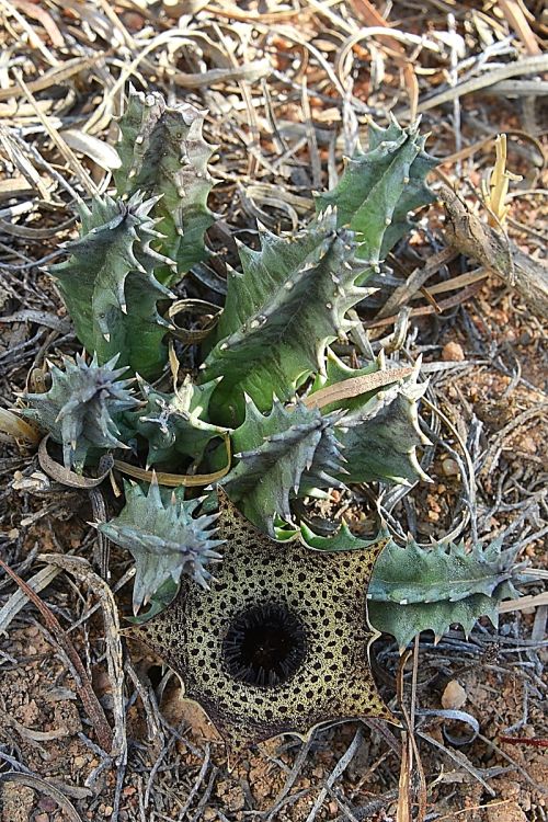 Obr 1: Huernia barbata na lokalitě v Jihoafrické republice, kde je poměrně rozšířeným a běžným druhem.