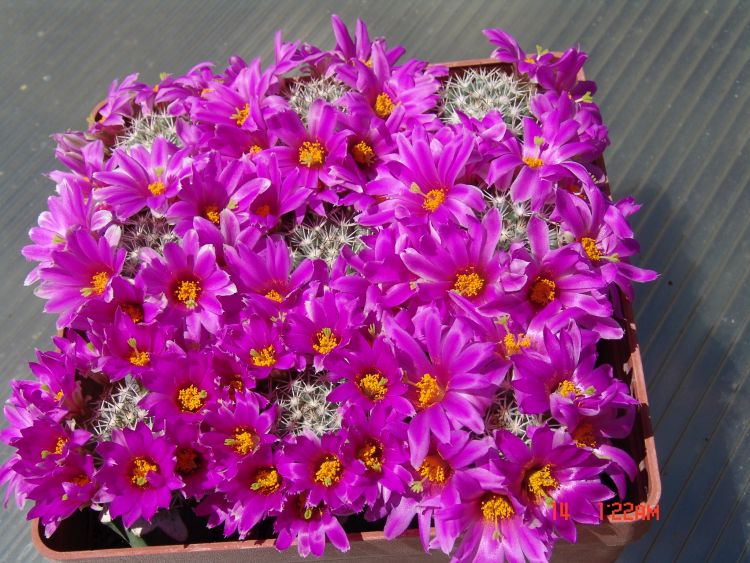 Povedlo se mi pár obrázků, chci se o ně s milými čtenáři podělit. První je fascinující sestava kvetoucích Bartschella (Mammillaria) schumannii ssp. globosa. Je to už druhá generace. Ta první pochází z několika semen, která jsem po trpělivém hledání našel na zemi, mezi kamínky okolo rostlinky, a která jsem tehdy bezostyšně zcizil.