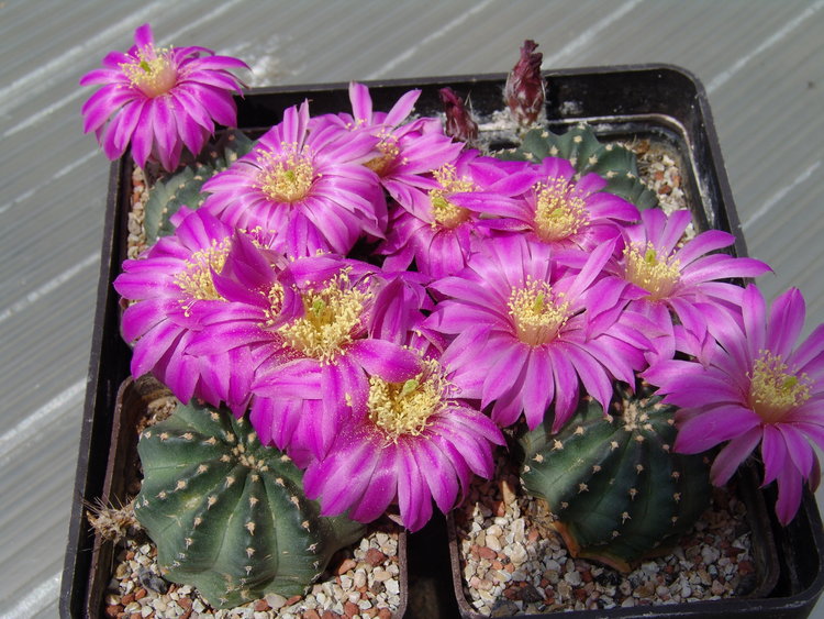 Z tohoto obrázku mám obzvláštní radost. Wilcoxia (nebo chcete-li Echinocereus) poselgeriana se za laskavé zimování blízko u okna odměnil takovouto kyticí překrásných květů. Kytka roste podobně jako ta předchozí, v nepříjemném, zaprášeném prostředí mezi keři, bez květů téměř neviditelná. Ale když vykvete – nádhera. Však byl hezký den, který jsme trávili venku, byl první máj, tak na den dostala čestné místo na zahradním stole coby okrasa celého okolí.