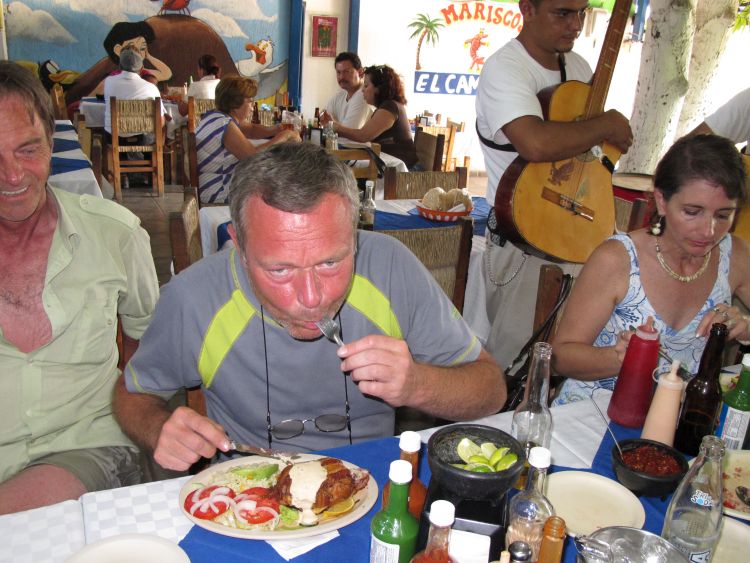 Marčelova rodina, už aj s jeho bratom a sestrou s rodinami, nás na večeru pozvali asi 50km odtiaľ do morskej reštiky, čo kluci nemusia. Jediné, čo jedávali bola konzerva s rybičkami a cibuľou, čo je asi najlacnejšie menu, ktoré preferovali. Chceli si aj objednať nejaký biftek ala ranchero, ale boli prehovorení. Popritom nám muzikant pospevoval Kukaraču. Dali sme si podľa odporučenia ryby, o ktorých sme nemali ani šajnu, len to, že sú morské. Určite to nebol žiadny český candát. Mne to veľmi vyhovovalo. Mám rád rybacie špeciality, aj morské príšery a iné dary mora. Marčelova sestra sedela vedľa mňa a objednala si kompletné menu s predjedlom a krevetkovou polievkou a veľkou pečenou rybou. Krevetky som jej v duchu závidel. Ako sa neskôr ukázalo, bol som rád, že som si dal len úžasnú rybaciu špecialitu. Strávili sme veľmi príjemné popoludnie. Ku stolu prišli hudobníci a brnkali mi na nervy na rozladenej gitare. Marčelova rodina sa snažila komunikovať v češtine, tak sme sa aspoň čo to dozvedeli. Len som na koniec nechápal čo sa deje, keď vrchný priniesol Marčelovmu bratovi a sestre účet. Stále na to pozerali a prepočítavali, hlasne španielsky komunikovali. Bolo mi to nepríjemné a pripadal som si tam ako somár. Nakoniec z toho vyplynulo, že každému rozpočítali, koľko kto má zaplatiť za svoje jedlo. Ešte nám pripočítali aj muzikanta a prepitné. Večer sme už ani poriadne nezaspali, navyše Láďo dostal taký prújem, že nestačil dobehnúť na WC. Zdeněk kľudne pospával vo svojej baldachýnovej posteli, len ja som skoro ráno nevedel pochopiť čo sa stalo, lebo i steny boli ofixírované. Tak sme sa rýchlo pobalili. Ešte som si bol z pláže vziať zvláštny čierny piesok, lebo čo som mal na balkóne, mi upratovačka pri upratovaní vyhodila. Tento piesok mi pri odlete skoro spôsobil veľké problémy. Neviem či som mal zatemnený mozog, ale pred odletom som si ho dal do topánok. Keďže piesok bol ťažký, dal som si ho radšej do príručného zavazadla. Kufor som mal zaplnený a dostatočne preťažený, tak sa mi to zdalo ako dobrý nápad. Hneď ako som dal príručné zavazadlo na pás, kontrola po prejdení scanerom spozornela, rovno siahla do topánky, kde bolo igelitové vrecko asi s kilom čierneho piesku. Keď otvorili sáčok i mne to hneď pripomínalo vojnu a pušný prach. Nečudoval som sa im. Ihneď volali posilu, prišli asi traja colníci v bielych rukavičkách, s kufríkmi. Našťastie som si z krku zložil fotoaparát a začal prehliadať spätne fotografie, dokiaľ som neprišiel ku fotkám, ako v trenkách ležím v zátoke na čiernom piesku. Podal som im foťák a snažil povedať, kde je problém. Našťastie to pochopili a na moje prekvapenie mi vrátili aj piesok, ktorý som opätovne dal do topánky. Iba počas letu som rozmýšľal, čo bude v Madride na letisku, ale tam sú zaťažení len na tequilu, tak to prešlo v pohode.