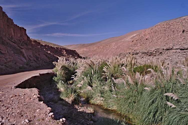 To vím, reaguje Pavel. Jak to? No protože jsem tady už nastupoval. Srandičky v takové nadmořské výšce musím ocenit. Roste tady zajímavá tráva Cortadelie. Stoupáme do výšin a pozorujeme čápy, osly, vikuni a plameňáky. Hele, údolím protéká potok.