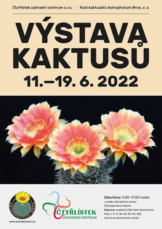 rád bych Vás všechny pozval jménem klubu Astrophytum Brno na tradiční výstavu kaktusů letos poprvé v netradičním termínu – 11-19.6.2022 – ovšem na tradičním místě ve Čtyřlístku, Brno-Bystrc.