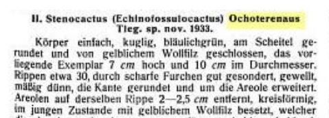Na obr. 6 je vzhledově velmi podobná rostlina, která by v přírodě mohla růst klidně vedle té typové někde ve vrcholové oblasti Cerro el Zamorano. Nicméně nesplňuje jednu z charakteristik, pro kterou si ji Ernst Tiegel ze zásilky Schmollových rostlin vybral pravděpodobně jako první k popisování, totiž výjimečně velký počet okrajových trnů – 22 nebo více. Zajímavé bylo, jak se s tímto faktem vypořádal Curt Backeberg, bezesporu jedna z největších kaktusářských legend. Počet trnů ve svém „upraveném“ popisu jednoduše vynechal a pod obrázek napsal: „Echinofossulocactus ochoterenaus Tieg. nebo nějaká forma téhož (oder eine Form desselben)“. A vynechal ještě jednu charakteristiku z původního popisu – jednotlivý růst. Originální popis totiž odnožování nepřipouští, uvádí naopak: „Körper einfach“ (tělo jednoduché – viz. obr. 7). Proč toto dvojí vynechání? Pravděpodobným důvodem mohl být konflikt fotografií s popisem, neboť jak snímek pořízený přímo panem F. Schmollem, tak snímek Backebergův dokládají jednu z nejdůležitějších druhových charakteristik – spontánní schopnost odnožování. Dnes se již těžko dozvíme, zda si paní Carolina neuvědomila totéž a obrázek odnožujícího E. ochoterenaus zveřejnila hned rok po uveřejnění originálního popisu právě proto, aby zpřesnila původně nesprávně uváděný jednotlivý růst. Druhým dílčím závěrem tedy může být, že se jedná o rostliny spontánně odnožující navzdory údajům v prvopisu.